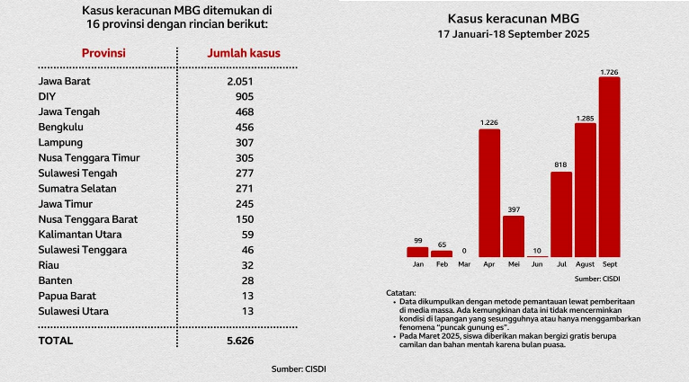Dari Tanggal data akhir hasil pantauan CISDI dari per 17 Januari hingga 18 September 2025 telah ada peningkatan jumlah data yang mengalami keracunan di beberapa daerah di Indonesia. Yang terlansir dari BBC News adalah